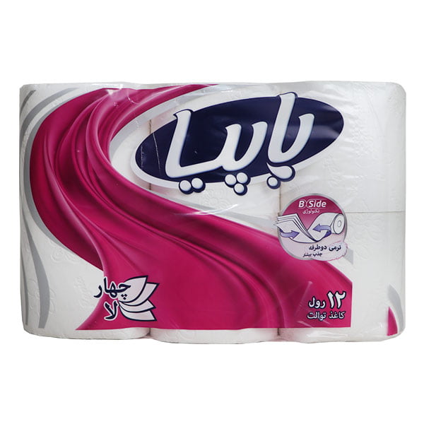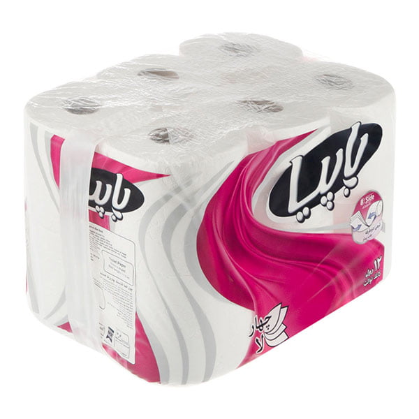 دستمال توالت پاپیا 4 لایه در بسته های 12 عددی تولیدشده و طول هر رول 17.5 متر است.