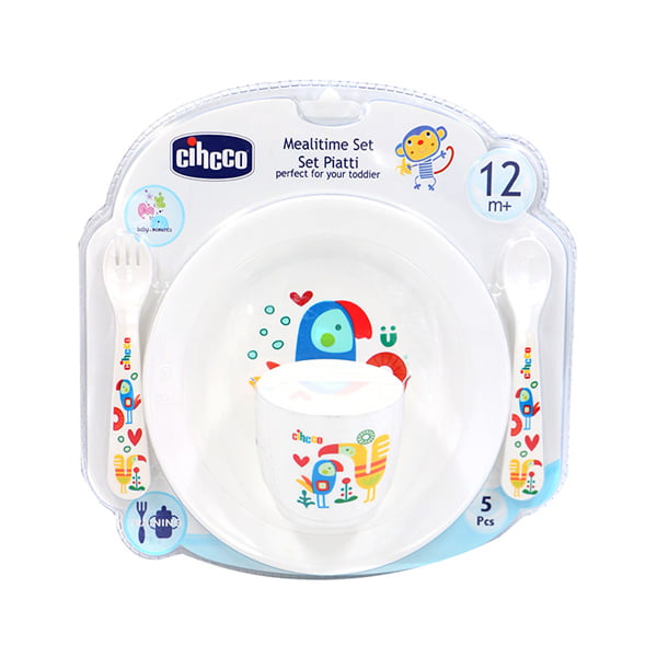 ست 5 تکه ظرف غذا کودک سیکو طرح طوطی رنگ سفید آبی شامل قاشق ، چنگال ، لیوان آبخوری و بشقاب گود و بشقاب مسطح می باشد.