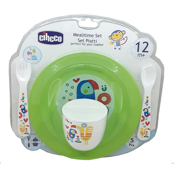 ست 5 تکه ظرف غذا کودک سیکو طرح طوطی رنگ سبز شامل قاشق ، چنگال ، لیوان آبخوری و بشقاب گود و بشقاب مسطح می باشد.